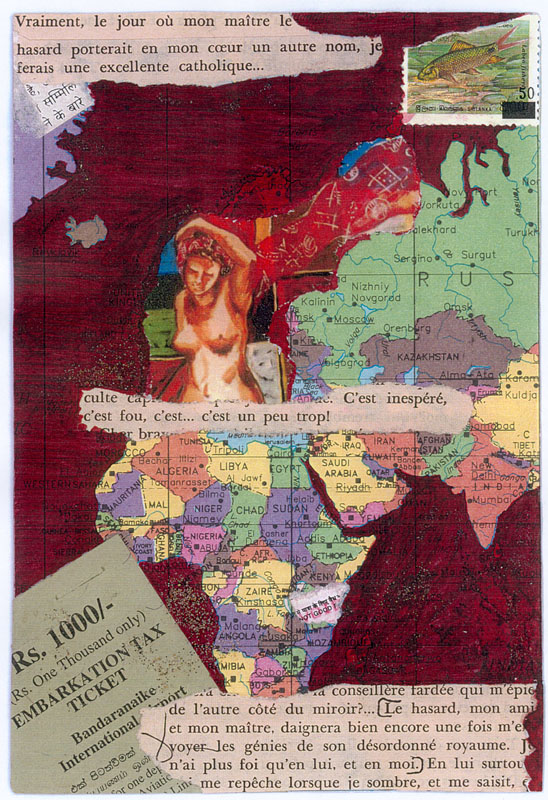 Variation intime sur les géographies de « L’Usage du Monde », « Le Poisson Scorpion », « Le Dehors et le Dedans ». Parallèlement à l’écriture des poèmes, les collages ci-dessous ont été réalisés tout au long de cette route d’une année, entre septembre 2001 et juin 2002.
